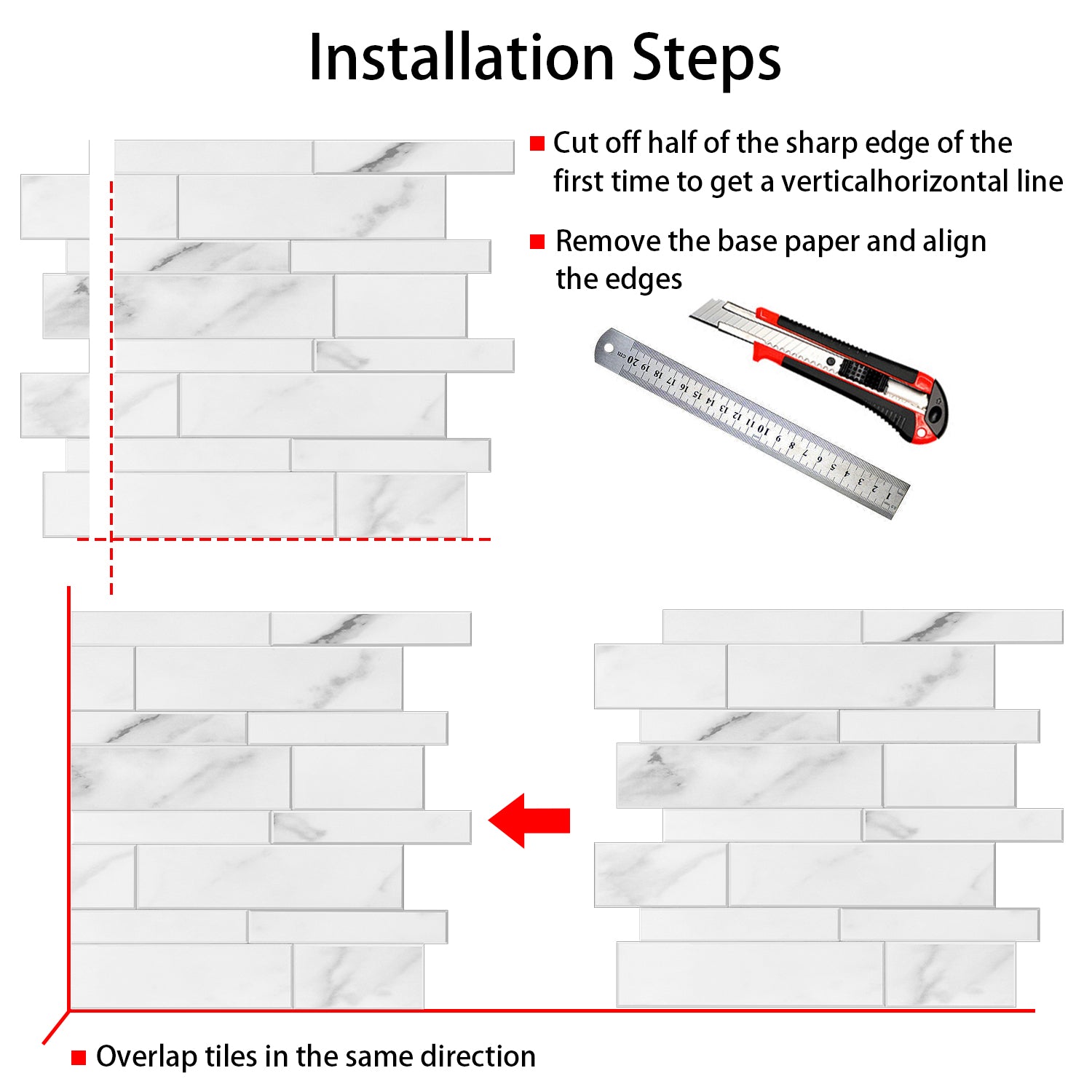 With an easy peel-and-stick design, you can transform a tired wall in hours—no grout, trades, or messy tools needed. Just measure your space, cut to fit with scissors or a craft knife, and press into place.